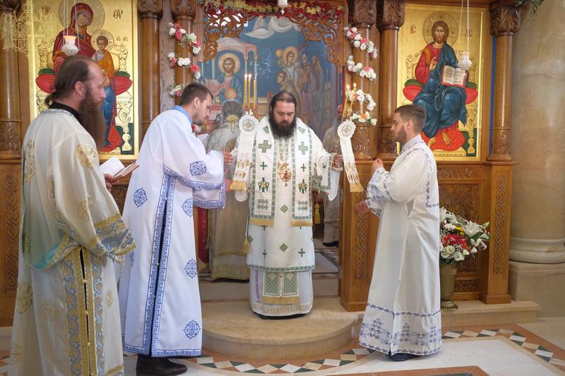 Њихова Преосвештенства епископи бачки Иринеј и мохачки Исихије саслуживали су Његовом Високопреосвештенству Митрополиту црногорско-приморском г. Амфилохију, који је началствовао светом архијерејском Литургијом која је служена након освећења наведеног храма у манастиру Ћелијама. Митрополиту су саслуживали и Архиепископ берлински и све Немачке г. Марко (Руска Загранична Црква), као и Преосвећена господа епископи: врањски Пахомије, шумадијски Јован, ваљевски Милутин, рашко-призренски Теодосије, крушевачки Давид, осечкопољски и барањски Херувим, умировљени епископи Атанасије и Јован, свештенство и монаштво више епархија Српске Православне Цркве.