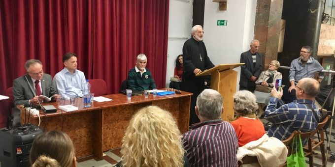 Прота Милош Весин обратио се присутнима на почетку трибине, истакавши завештање које су говорници имали према професору Владети Јеротићу, који је и сâм намеравао да организује трибину о хришћанству и детету.