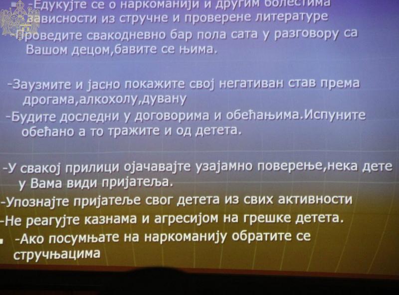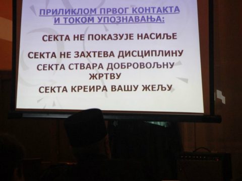 О овој актуелној теми су говорили: г. Зоран Луковић, члан Европске федерације за праћење секти, и г. Ламбе Ђорелијевски, специјални педагог, некадашњи шеф Одсека за превенцију наркоманије при Криминалистичкој полицији у Београду.