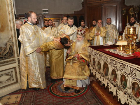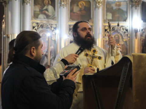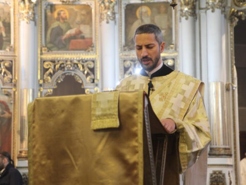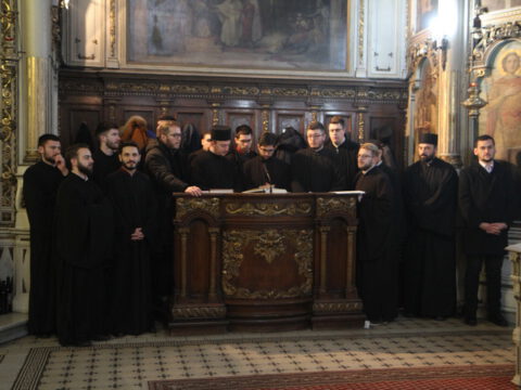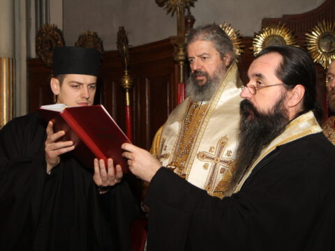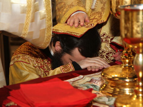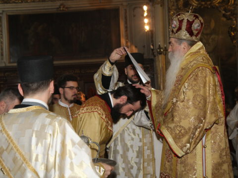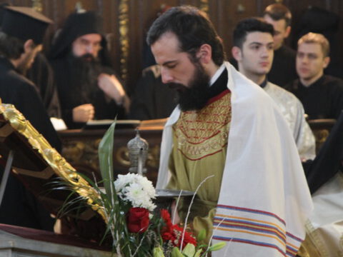У току свете Литургије, владика Иринеј рукоположио је монаха Јустина (Живанића) у чин јерођакона.