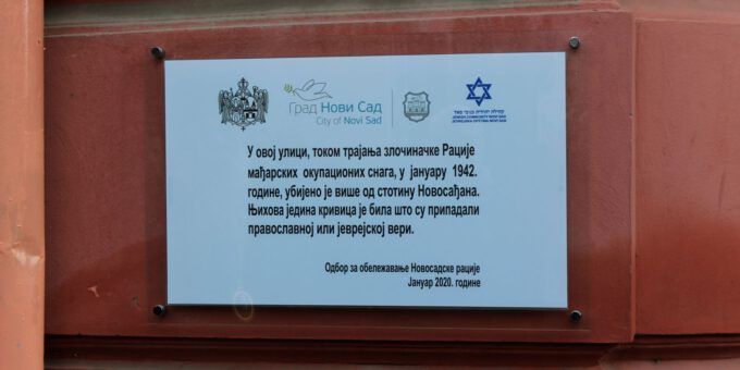 Прву спомен-плочу посвећену колективном страдању у Новосадској рацији свечано су открили, 23. јануара 2020. године, Његово Преосвештенство Епископ бачки г. др Иринеј, г. Милош Вучевић, градоначелник Новог Сада, и г. Мирко Адам, председник Јеврејске општине Нови Сад.