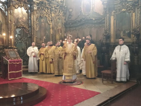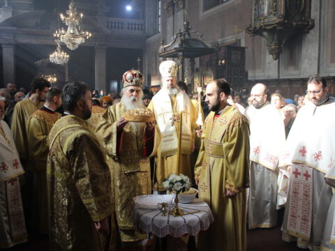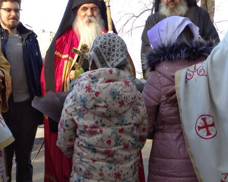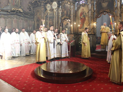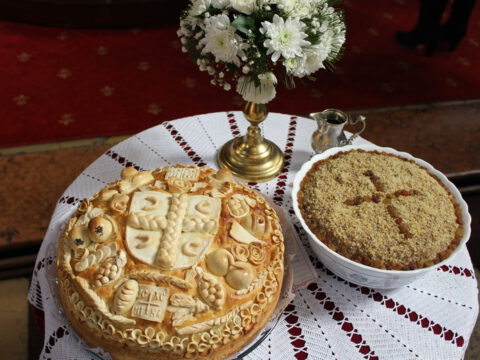 После заамвоне молитве, владика Иринеј благословио је принесене славске дарове, колач и жито.