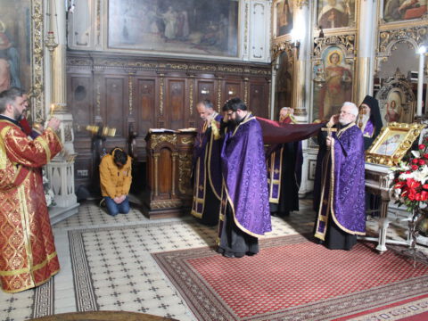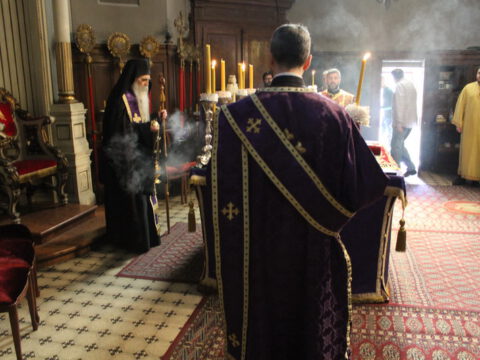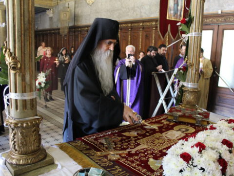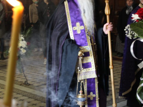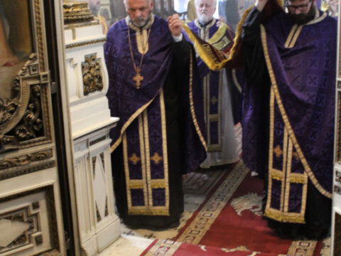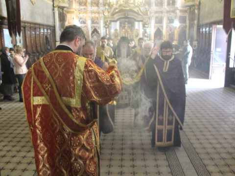 Уз појање стихире ,,Тебе одјејушчагосја свјетом јако ризоју”, Његово Преосвештенство Епископ новосадски и бачки господин Иринеј, уз саслужење братства Саборног храма, предводио је део Вечерње службе, када се износи и полаже плаштаница у Христов гроб.