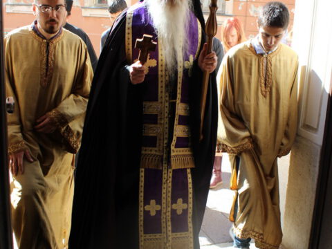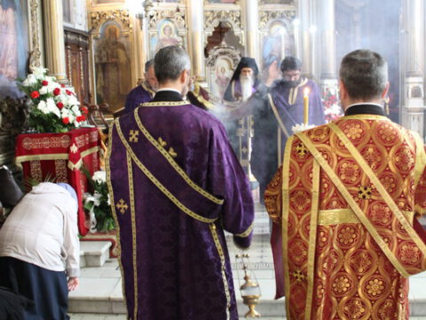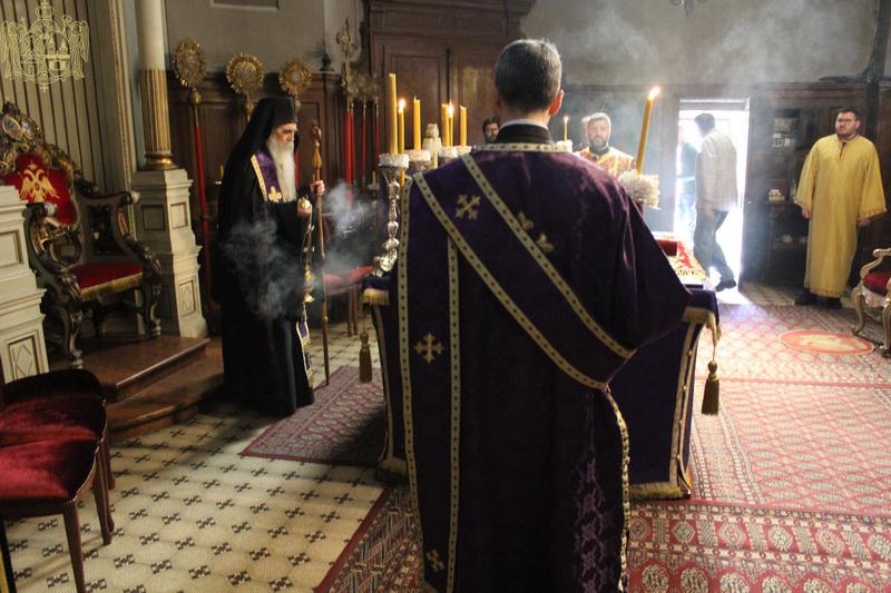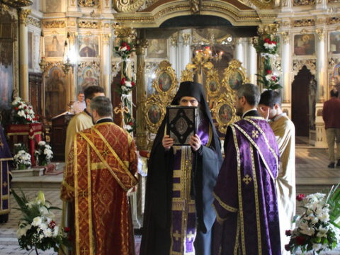 Уз појање стихире ,,Тебе одјејушчагосја свјетом јако ризоју”, Његово Преосвештенство Епископ новосадски и бачки господин Иринеј, уз саслужење братства Саборног храма, предводио је део Вечерње службе, када се износи и полаже плаштаница у Христов гроб.