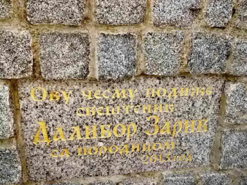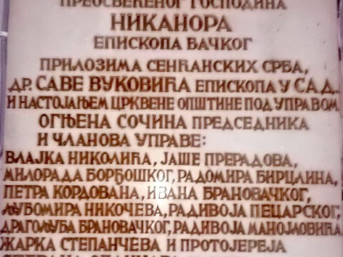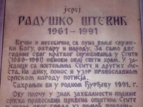 На самом улазу у храм налази се спомен плоча на јереја Радушка Штевића, пароха сенћанског. Његово име остаје неодвојиво од рестаурације и обнове којом је храм заблистао својим пуним сјајем.