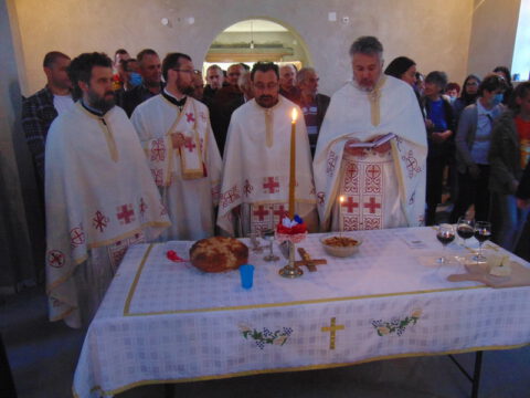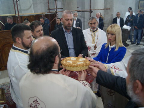 После прочитаног Јеванђеља беседио је отац Стевица Илић. Након заамвоне молитве одржана је литија, а затим су благосиљани славски дарови које је принео црквени кум, г. Јован Гркавац са својом породицом. За новог кума се јавио г. Дамир Мишковић.