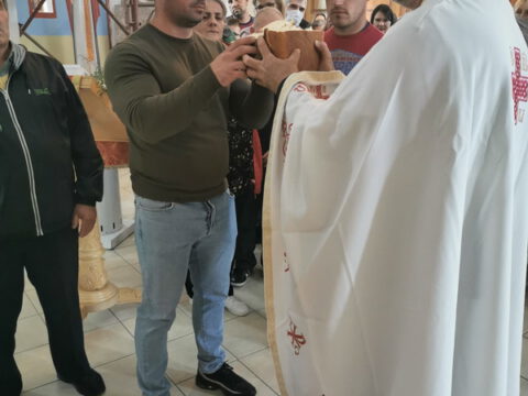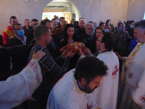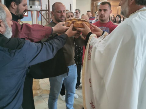 По заамвоној молитви извршен је трократни опход око храма. Освећен је и преломљен славски колач и благосиљано славско вино и кољиво, које је припремио храмовни кум, г. Јован Росић са породицом. Изразивши захвалност овогодишњем куму, презвитер Синиша Тривић је предао залог славског колача г. Арсенију Старовићу, као благослов за кумство у следећој години Господњој.