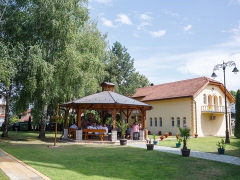 Пред сам крај наше данашње посете, застајемо у порти. У густој хладовини старих стабала налази се летњиковац који је важно место сусрета верника, а неретко и безбрижно место за дечју игру.