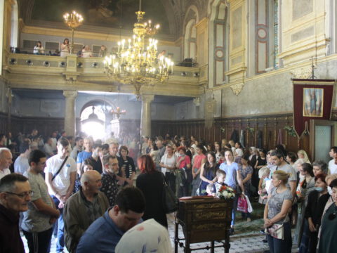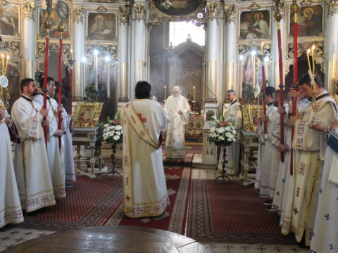 У недељу Свете Педесетнице, 25. маја/7. јуна 2020. године, Његово Преосвештенство Епископ новосадски и бачки госпoдин Иринеј началствовао је на светој Литургији у Саборном храму у Новом Саду, а саслуживали су Епископ мохачки господин Исихије, братство Саборног храма и новосадски ђакони.