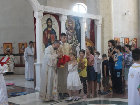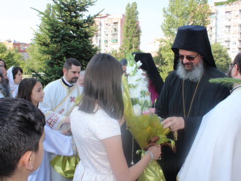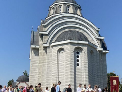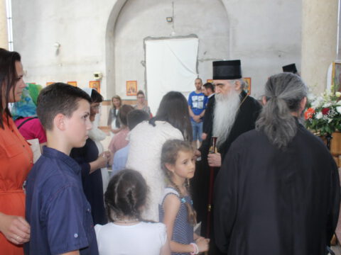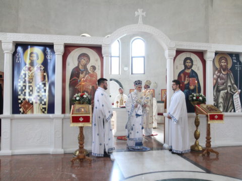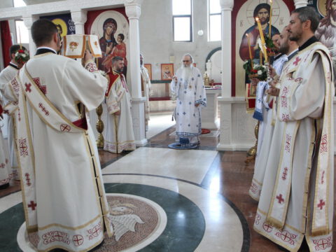 У порти Светосавског храма епископе је дочекало мноштво вернога народа, а деца су упутила срдачну добродошлицу Преосвећеним епископима Иринеју и Исихију. Текст поздрава налази се у приложеном документу.