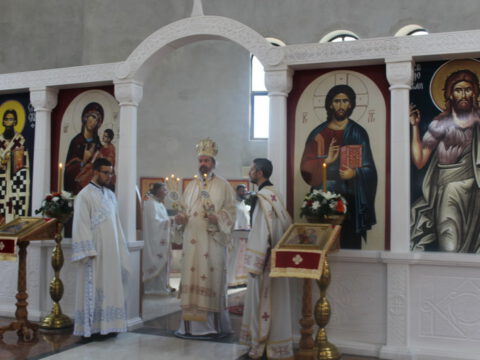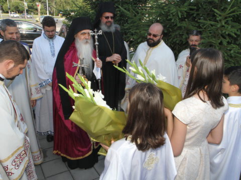 У порти Светосавског храма епископе је дочекало мноштво вернога народа, а деца су упутила срдачну добродошлицу Преосвећеним епископима Иринеју и Исихију. Текст поздрава налази се у приложеном документу.