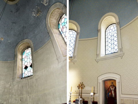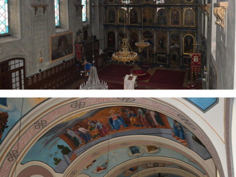 После десетак година од првобитне обнове, када Црквена општина каћка обезбедила довољно средстава, уследило је улепшавање унутрашњости светога храма. Иконостас је резао Милош Девић из Бачке Паланке, а осликао га је Ђорђе Ракић, живописац из Нештина 1863/64. године, као и иконе на певницама, Богородичином и владичанском трону. Иконостас са три зоне и крстом на врху богато је украшен флоралним орнаментима, венцима лишћа, пупољцима цвећа и коринтским капителима у првој зони. Зидне слике на северном и јужном зиду, као и сцене на сводовима храма радио је живописац Димитрије Петровић из Новог Сада, током 1886. године, чиме је и завршено потпуно уређење унутрашњости храма.