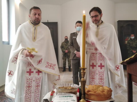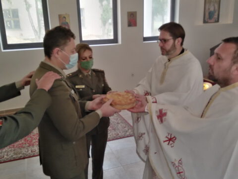 Сомбор – У недељу, 8. новембра 2020. године, када наша света Црква молитвено спомиње Светог великомученика и чудотворца Димитрија Солунског, војни параклис у 1. центру за обуку Сомбор прославио је свог духовног патрона. Светом Литургијом началствовао је протонамесник Саво Николић, архијерејски намесник сомборски, уз саслужење протонамесника Жељка Васића, пароха апатинског. У надахнутој беседи по прочитаној јеванђелској перикопи, отац Саво истакао је свагда присутну везу Цркве, војске и народа у заједничком делу очувања духовних и националних вредности, указавши на светао лик Христовог војника, светог Димитрија Солунског, као пример свестраног служења истини и правди Божјој. Испред христољубивог војинства сабраног око свог небеског покровитеља, благослов приноса славских дарова припао је овогодишњем куму, старијем воднику 1. класе Мирославу Мандићу. Из разлога поштовања мера заштите од коронавирусне инфекције, целокупан састав ове јединице био је оличен у заменику команданта Центра, потпуковнику Дејану Хркаловићу, као и одабраним официрима и подофицирима који су на дужности на бранику отаџбине, а службују у касарни Аеродром у Сомбору. Кумство за наредну годину прихватила је поручник Душица Жижић.
