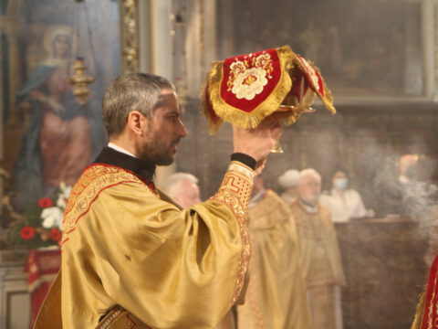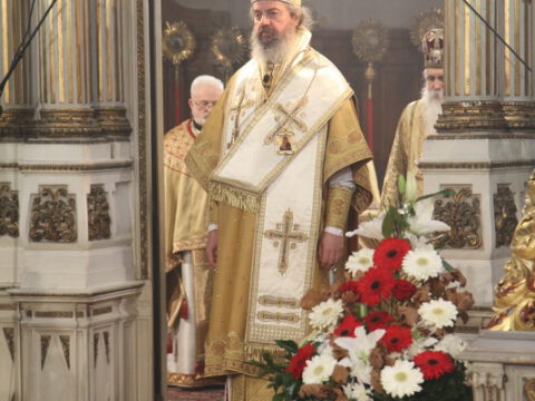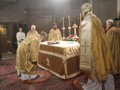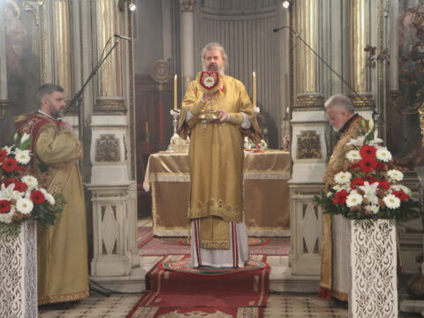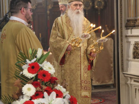 На светој архијерејској Литургији началствовао је Његово Преосвештенство Епископ новосадски и бачки господин Иринеј, уз саслужење Његовог Преосвештенства Епископа мохачког господина Исихијa и братства Саборног храма.