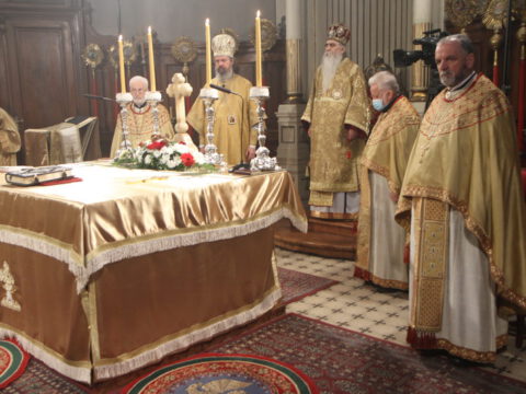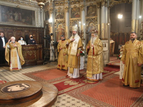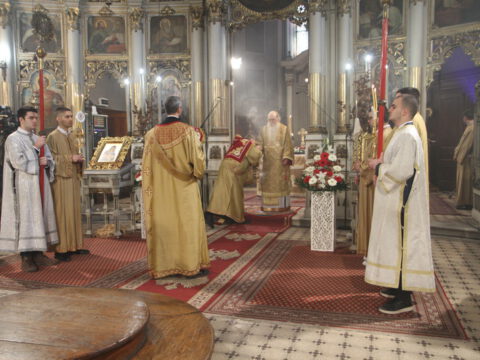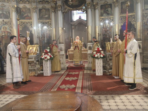 На светој архијерејској Литургији началствовао је Његово Преосвештенство Епископ новосадски и бачки господин Иринеј, уз саслужење Његовог Преосвештенства Епископа мохачког господина Исихијa и братства Саборног храма.