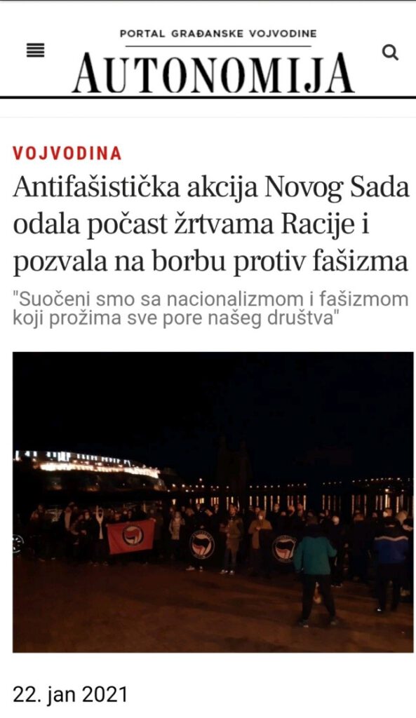 Самозвани антифашисти и јунаци вести бомбастичног наслова на наведеном порталу су за ,,одавање почасти” жртвама Новосадске рације изабрали вечерње сате 22. јануара 2021. године, као најпогоднији термин за свој политички перформанс. У самом тексту се не наводи тачно време скупа, али фотографија која га илуструје даје довољно информација и потврђује познату изреку да једна слика вреди више од хиљаду речи.