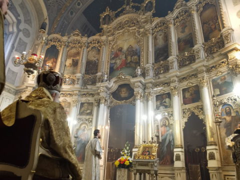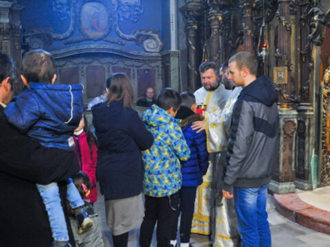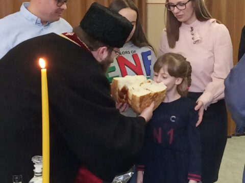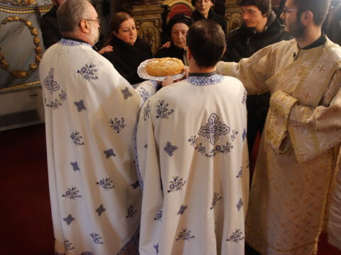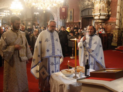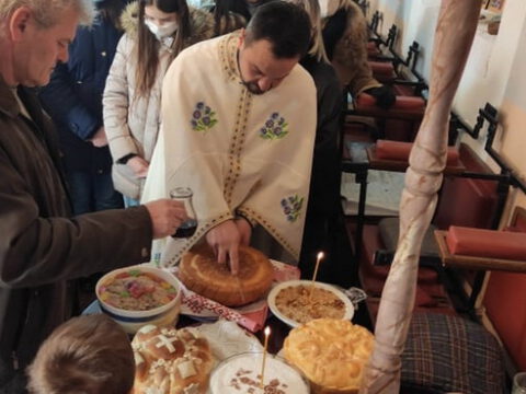 После тропара, пререзан је славски колач и благосиљано кољиво које је спремио овогодишњи кум славе, господин Ђорђе Ђурић са породицом.