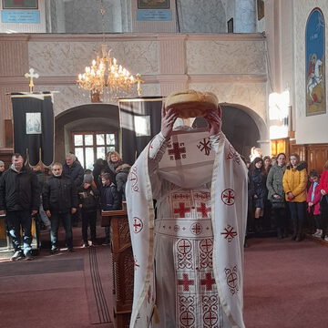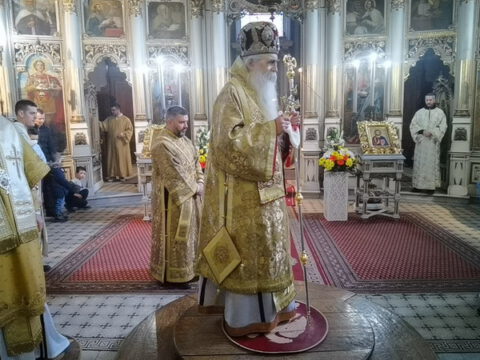 Владика Исихије је, уз саслужење протопрезвитера Миодрага Шипке и ђакона Бранка Бандобранског, освештао славски колач и жито.