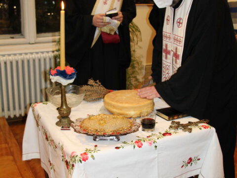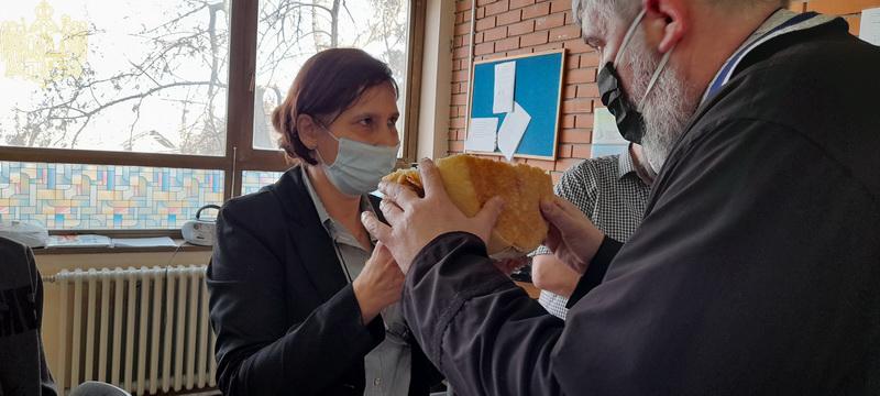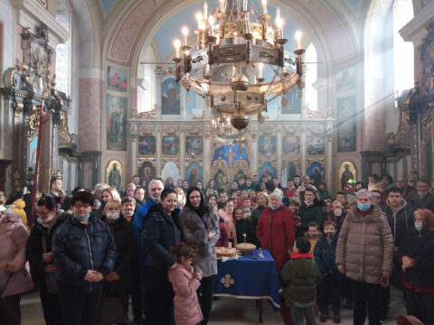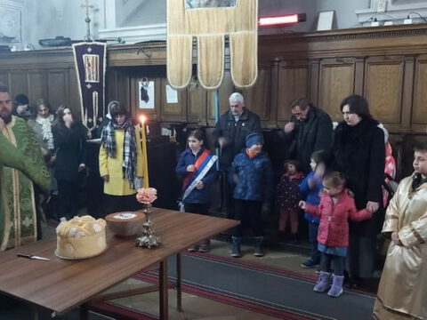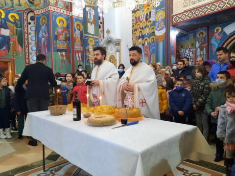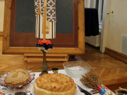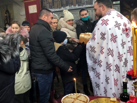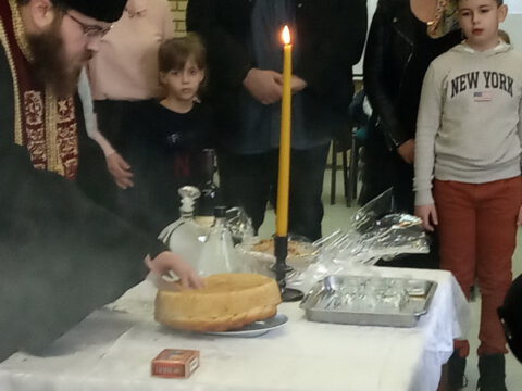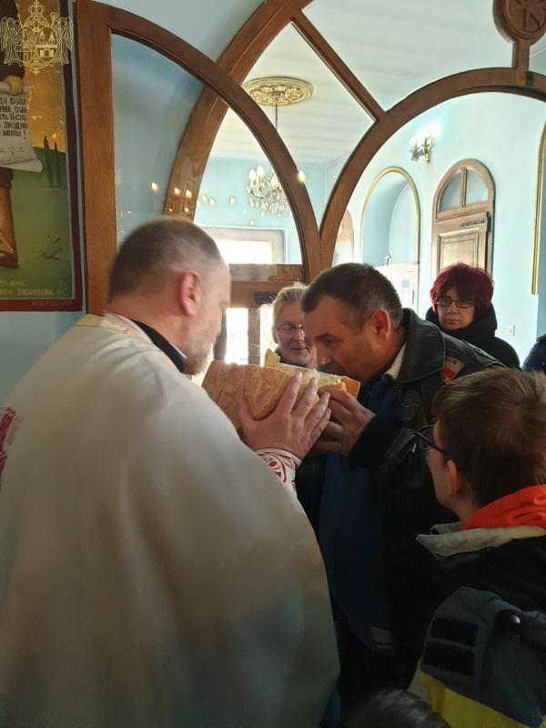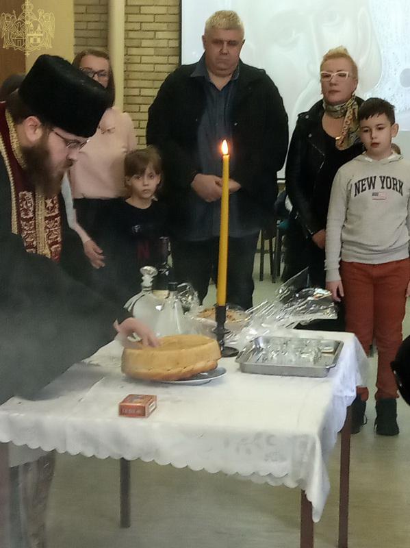 После тропара, пререзан је славски колач и благосиљано кољиво које је спремио овогодишњи кум славе, господин Ђорђе Ђурић са породицом.