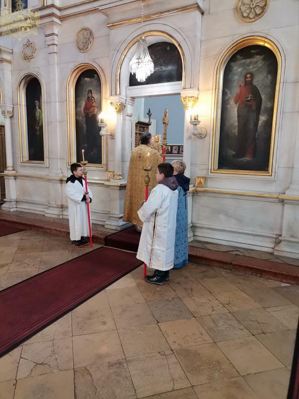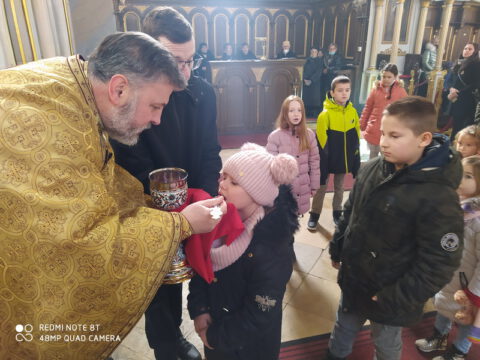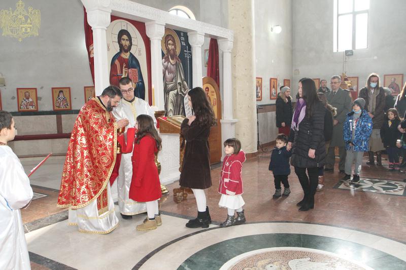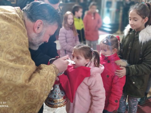 Светим Тајнама Тела и Крви Христове причестило се мноштво верника и дечице. После заамвоне молитве извршен је Чин благосиљања славских дарова – колача и кољива – а по датом отпусту Литургије уприличен је Светосавски рецитал. Сваком детету, које је било учесник рецитала, а, наравно, на крају и свој осталој присутној дечици подељени су светосавски пакетићи, а све то на свеопшту радост и задовољство свих сабраних: свештеникâ, родитељâ и дечице. Овогодишњи рецитал припремила је вероучитељица, госпођа Јелена Цанев.