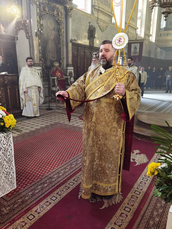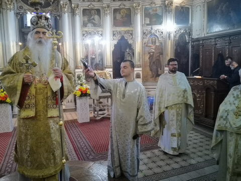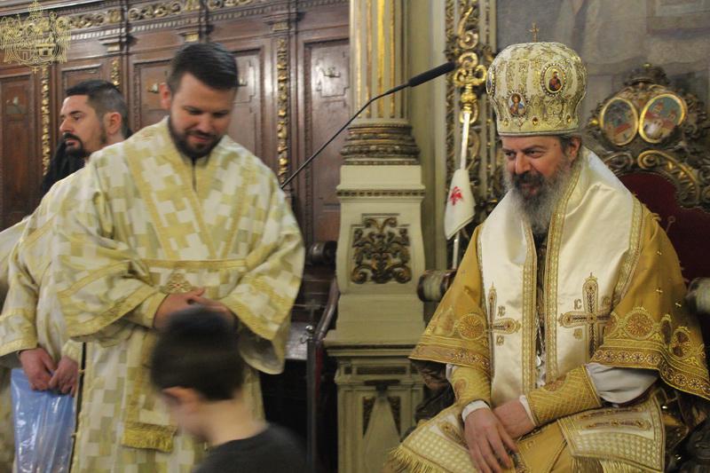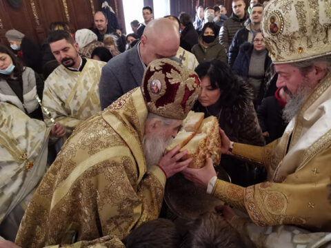 Владика Исихије је, уз саслужење протопрезвитера Миодрага Шипке и ђакона Бранка Бандобранског, освештао славски колач и жито.