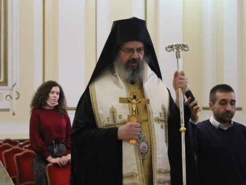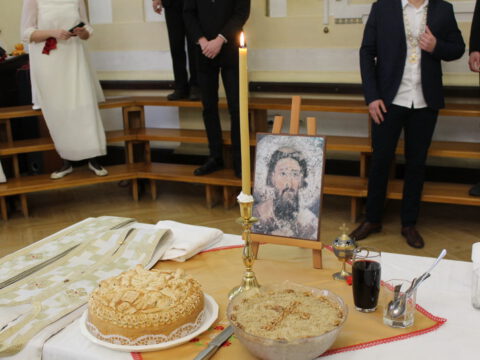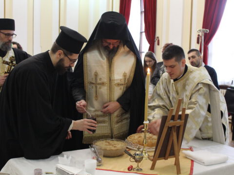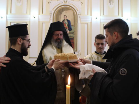 Владика Исихије је, уз саслужење протопрезвитера Миодрага Шипке и ђакона Бранка Бандобранског, освештао славски колач и жито.