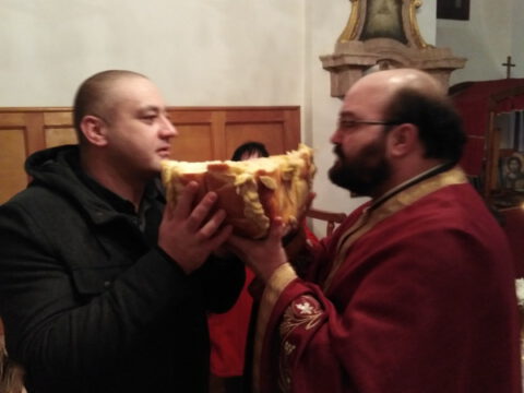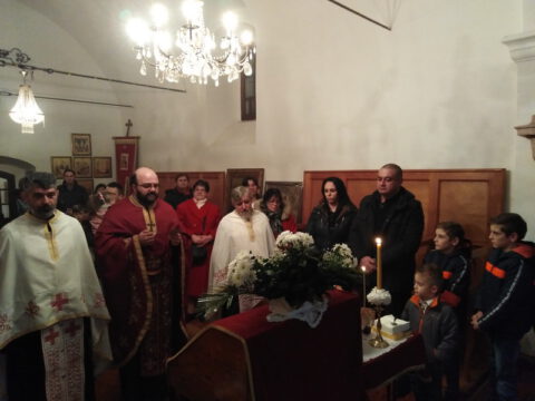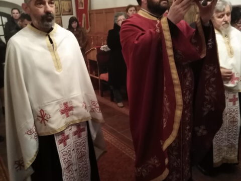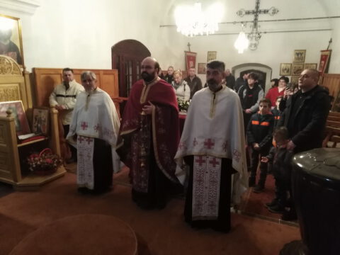На вечерњој служби је началствовао архијерејски намесник новосадски други, протојереј Бранислав Мркић, а саслуживали су: протонамесник Горан Артуков, парох ченејски, и протојереј Винко Стојаковић, парох у пензији. На крају службе је освећено кољиво и пререзан славски колач. Отац Бранислав је, у беседи, истакао значај свете тројице Јерараха, подсећајући да су они писци свете Литургије. У име парохијана и кума славе, г. Уроша Ђорђевића и његове породице, отац Огњен је захвалио свима који су дошли да увеличају празнично славље.