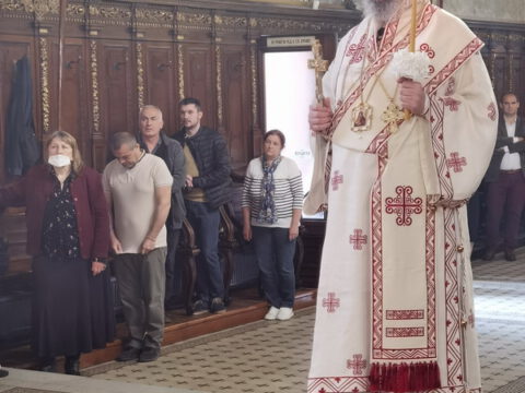 На крају вечерњег богослужења, верни народ Божји приступио је целивању Часног Крста, светог Јеванђеља и иконе Васкрсења Христова, добивши том приликом благослов Божји преко руку Епископа, поздрављајући се сверадосним васкршњим поздравом: