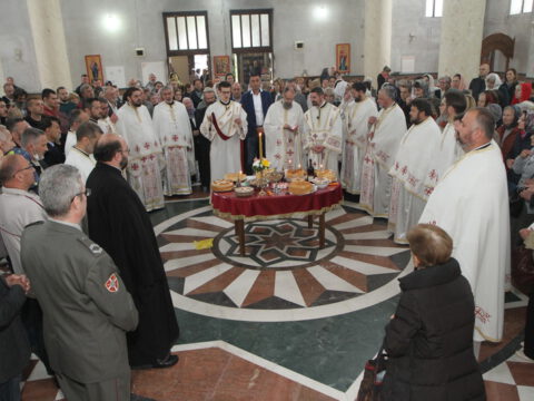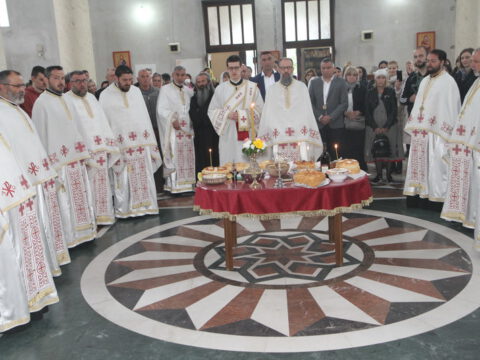 Протојереј Миодраг Шипка, архијерејски намесник новосадски први, благосиљао је славске дарове, колач и кољиво, а после отпуста, протопрезвитер Бранислав Мркић, настојатељ Светосавског храма на Новом насељу, заблагодарио је свима који су дошли да увеличају празновање славе храма Преноса моштију Светога Саве.