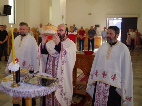 После трикратног литијског опхода и помена ктиторима и свештенослужитељима светога храма, извршено је освећење славских дарова – кољива и колача, које је принео овогодишњи кум, г. Ненад Ђурђевић из Бачког Брестовца са својом породицом. Кумство за следећу годину преузео је Ненад Ђурђевић, унук овогодишњега кума.