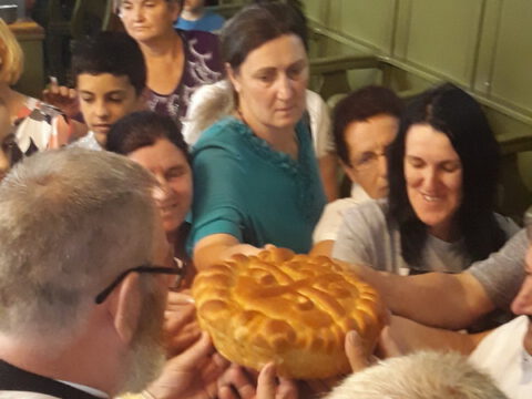 Овогодишња кума славе, Јованка Савановић, свечано је уручила залог кумства за наредну годину новим кумовима, Вањи и Маји Станковић.