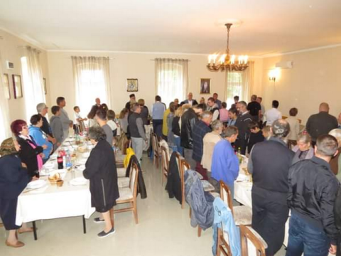 Једнодушно благодарећи Богу и Пресветој Богородици, у црквеној порти приређено је скромно послужење за све сабране. Вечерње богослужење је служио презвитер Живко Рајиновић, парох из Горњег Ковиља, уз саслужење презвитера Ивана Спасевског, пароха уз Темерина, и протојереја-ставрофора Радивоја Нунића, умировљеног пароха ченејског. Вечерњем богослужењу и благосиљању славских дарова присуствовао је и презвитер Лео Малешевић, парох из Каћа. После вечерњег богослужења, извршен је чин благосиљања славских дарова, а потом је уприличена трпеза љубави.