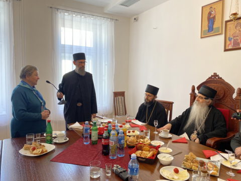 Гости су потом дочекани у дворани Црквене општине новосадске, где су у лепој и срдачној атмосфери разговарали са Преосвећеним владиком Иринејем, у присуству Епископа мохачког Дамаскина и протојереја Миодрага Шипке, архијерејског намесника новосадског првог.