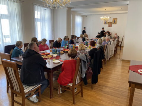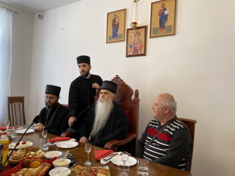 Гости су потом дочекани у дворани Црквене општине новосадске, где су у лепој и срдачној атмосфери разговарали са Преосвећеним владиком Иринејем, у присуству Епископа мохачког Дамаскина и протојереја Миодрага Шипке, архијерејског намесника новосадског првог.