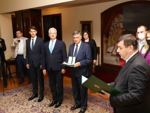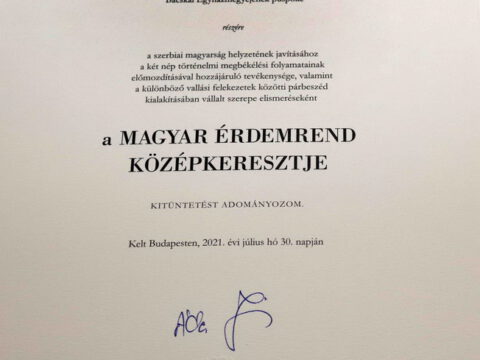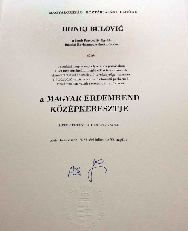 -Ваша Светости, Ваше Преосвештенство, поштоване даме и господо, поштовани гости, Јанош Адер, председник Републике Мађарске, одликовао је Иринеја Буловића, Епископа новосадског и бачког, сомборског и сегединског, Средњим крстом мађарског ордена за заслуге. Улога Иринеја Буловића у историјском помирењу мађарског и српског народа и његов рад на промоцији међуверског дијалога значајно су допринели јачању поверења и развоју односа између два народа. Између Мађарске и Србије 2012. године у Будимпешти је покренут један процес помирења који је следеће године имао свој наставак у Београду и Чуругу, приликом којег су председници Мађарске и Србије одали пошту у знак сећања на невине мађарске и српске жртве страдале у Другом светском рату. Напори који су уследили након овога, политички гестови и развој друштвених односа допринели су томе да смо до сада већ успели да оставимо иза нас ране из прошлости и да почнемо да градимо заједничку будућност. Помирење и заједничка изградња будућности није могла да се започне без људи попут Епископа новосадског и бачког, сомборског и сегединског господина Иринеја.