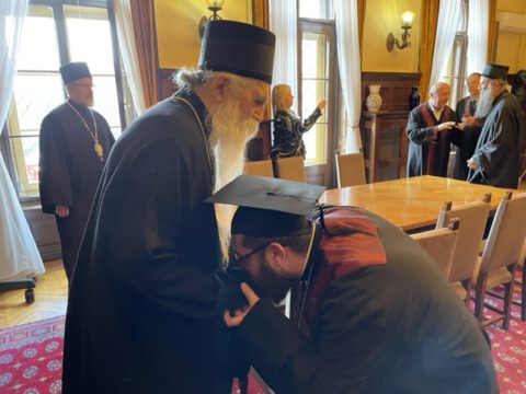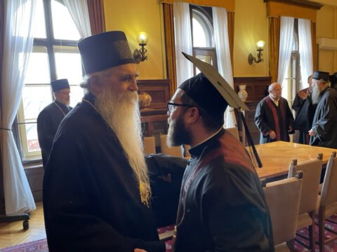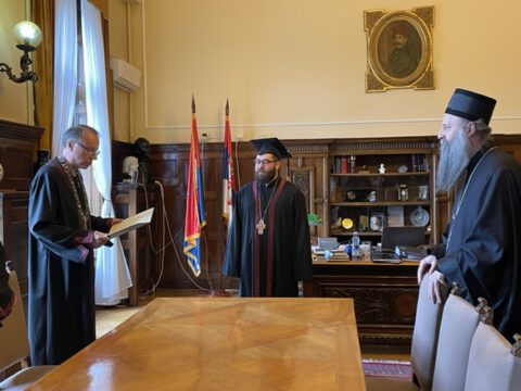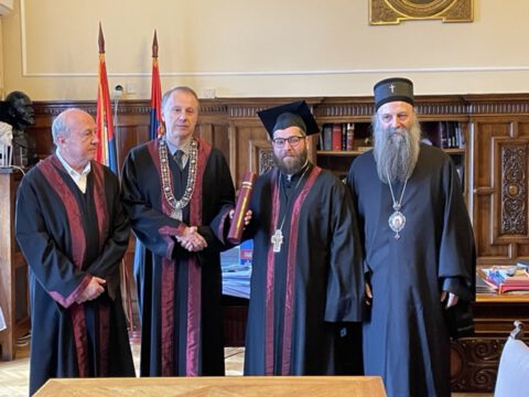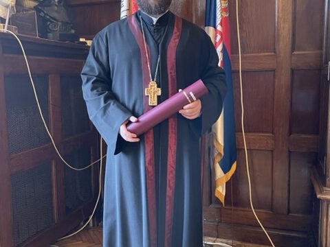 Пред комисијом у саставу: професор др Владимир Вукашиновић (ментор), професор др Србољуб Убипариповић и професор др Владимир Симић, 10. априла 2021. године, одбранио је докторску дисертацију, под називом Литургијска теологија дела Захарије Орфелина ‘Против папства римског’ (ПБ Рс 214) у контексту конфесионално-полемичке литературе Карловачке митрополије XVIII века.