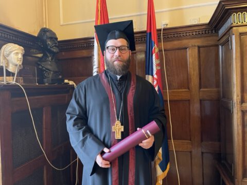 Пред комисијом у саставу: професор др Владимир Вукашиновић (ментор), професор др Србољуб Убипариповић и професор др Владимир Симић, 10. априла 2021. године, одбранио је докторску дисертацију, под називом Литургијска теологија дела Захарије Орфелина ‘Против папства римског’ (ПБ Рс 214) у контексту конфесионално-полемичке литературе Карловачке митрополије XVIII века.
