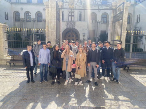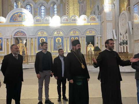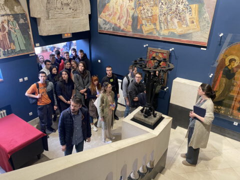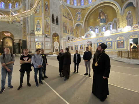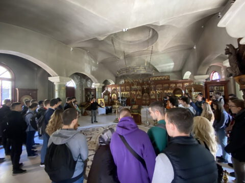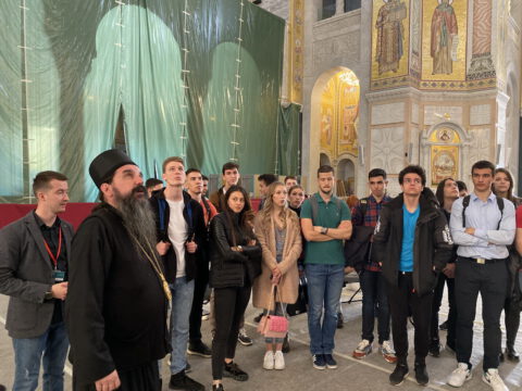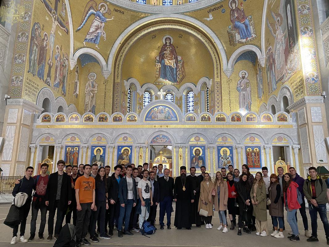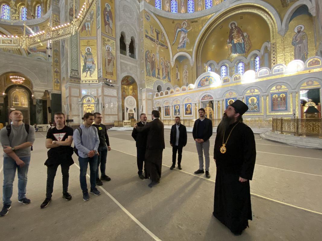 По благослову Његове Светости Патријарха српског господина др Порфирија, ученике и професоре гимназије у Храму Светог Саве дочекао је Његово Преосвештенство Епископ топлички господин Јеротеј, викар Патријарха српског. У обраћању ученицима и професорима, владика је изразио речи добродошлице и пренео поздраве и благослове Његове Светости Патријарха српског господина Порфирија. Ученици су потом присуствовали предавању у крипти Храма Светог Саве.