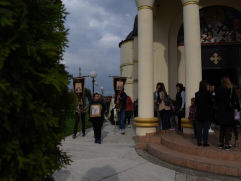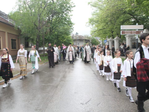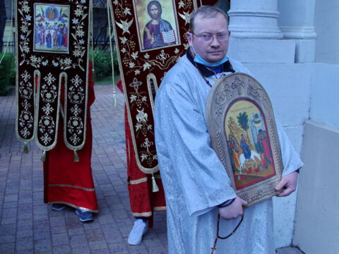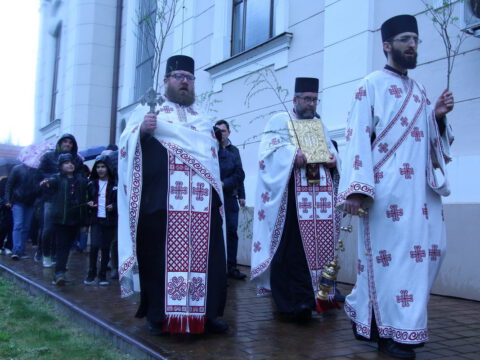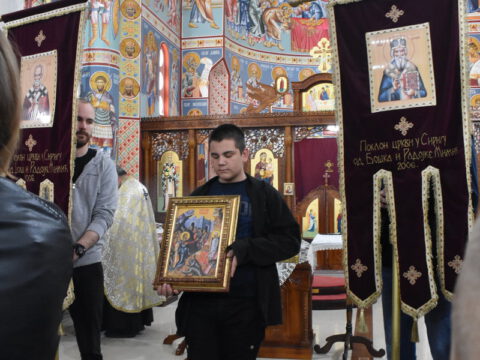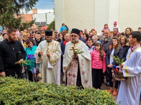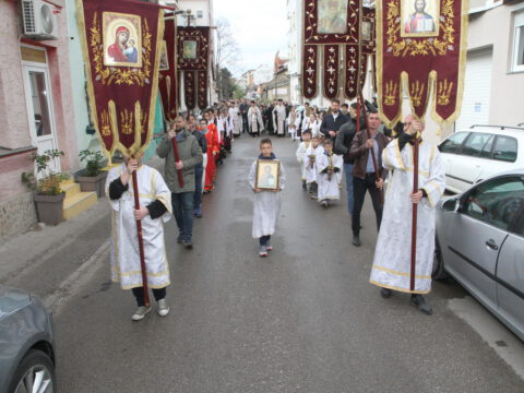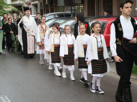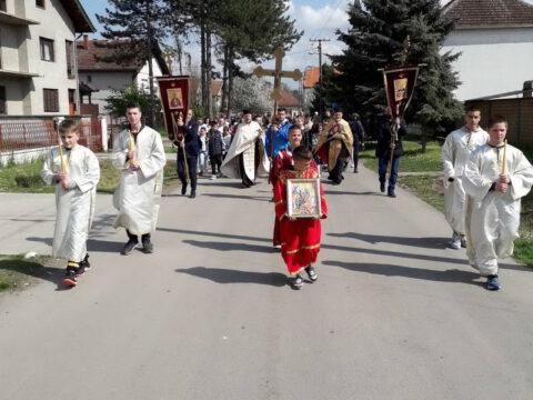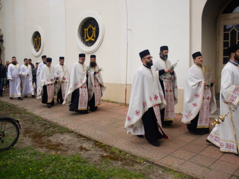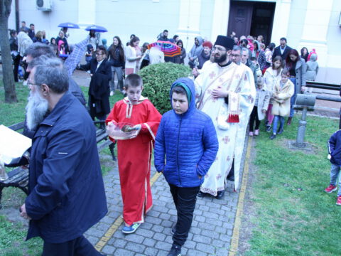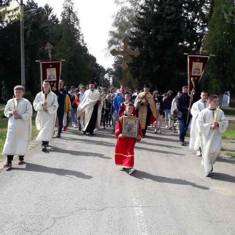 После вечерњег богослужења, у присуству верног народа и многобројне деце, освештане су врбове гранчице и извршена је литија око храма.