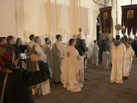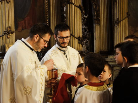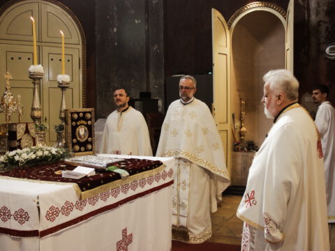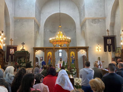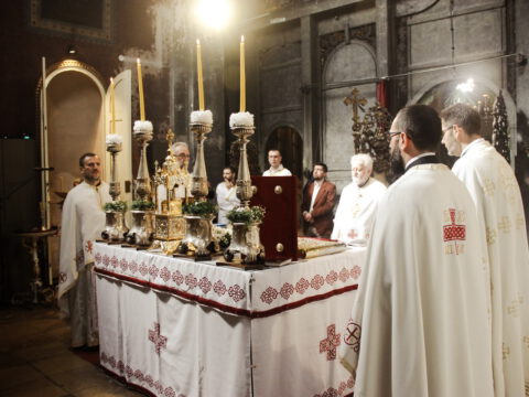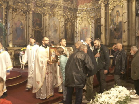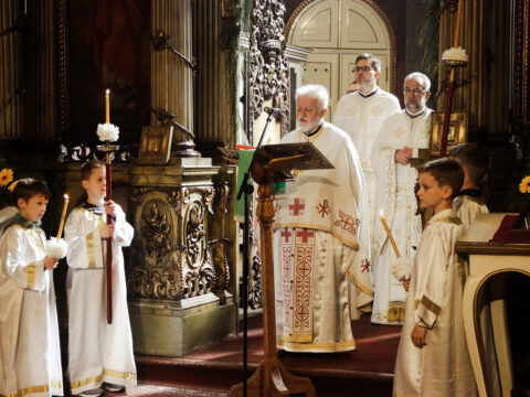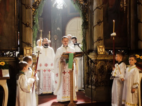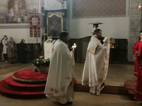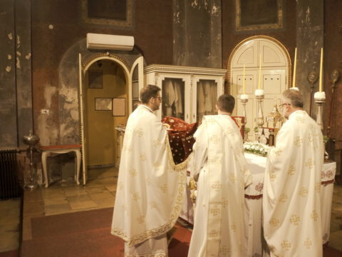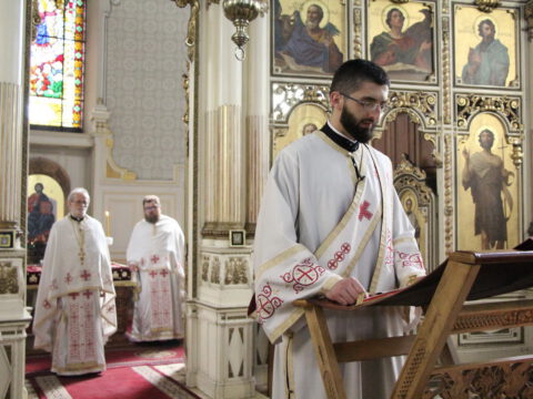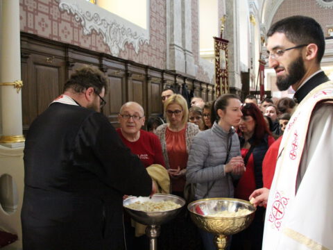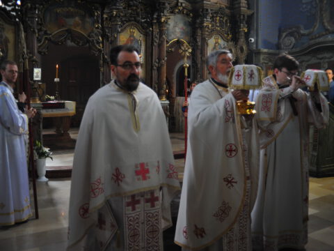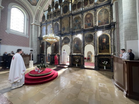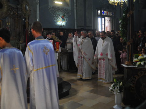 Светој Литургији у Световазнесенском храму у Суботици присуствовали су фра Зденко Грубер, гвардијан фрањевачког самостана у Суботици и његов сабрат Ђено.
