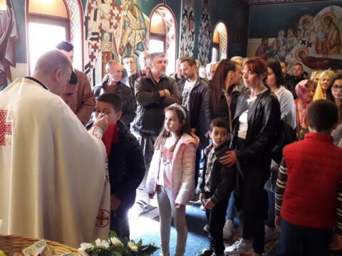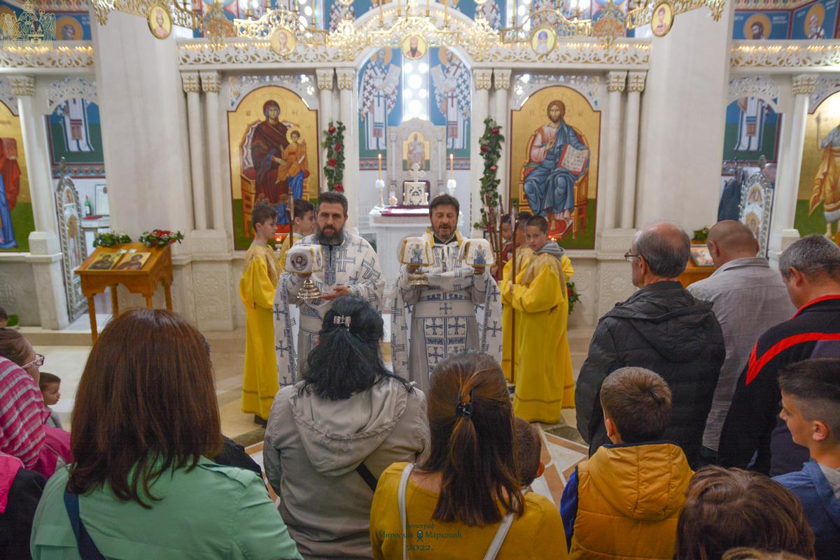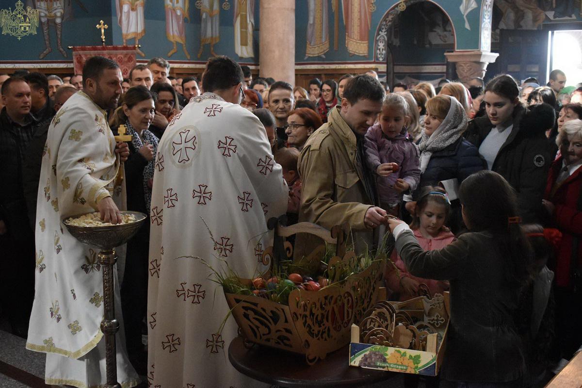 После заамвоне молитве, свештенослужитељи су освештали васкршња јаја која су потом подељена верном народу. Празничну свету Литургију својим милозвучним појањем увеличао је домаћи дечји хор који је предводила диригент Смиљана Вуков.