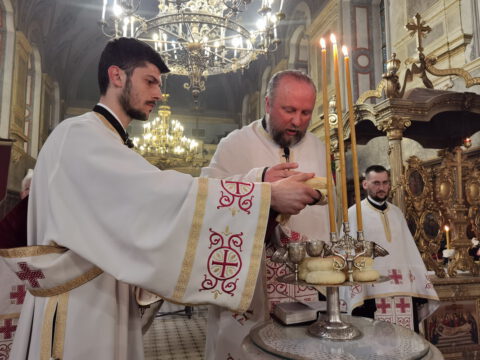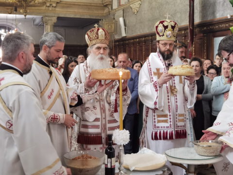 После опхода, владика Иринеј је благословио славске дарове, које су ове године са љубављу, Господу у славу, а у част светог великомученика Георгија, принели кумови храмовне славе, Војислав и Данијела Ковачевић. Светој Литургији је присуствовао господин Никола Перваз, председник Црквене општине у Новом Саду.