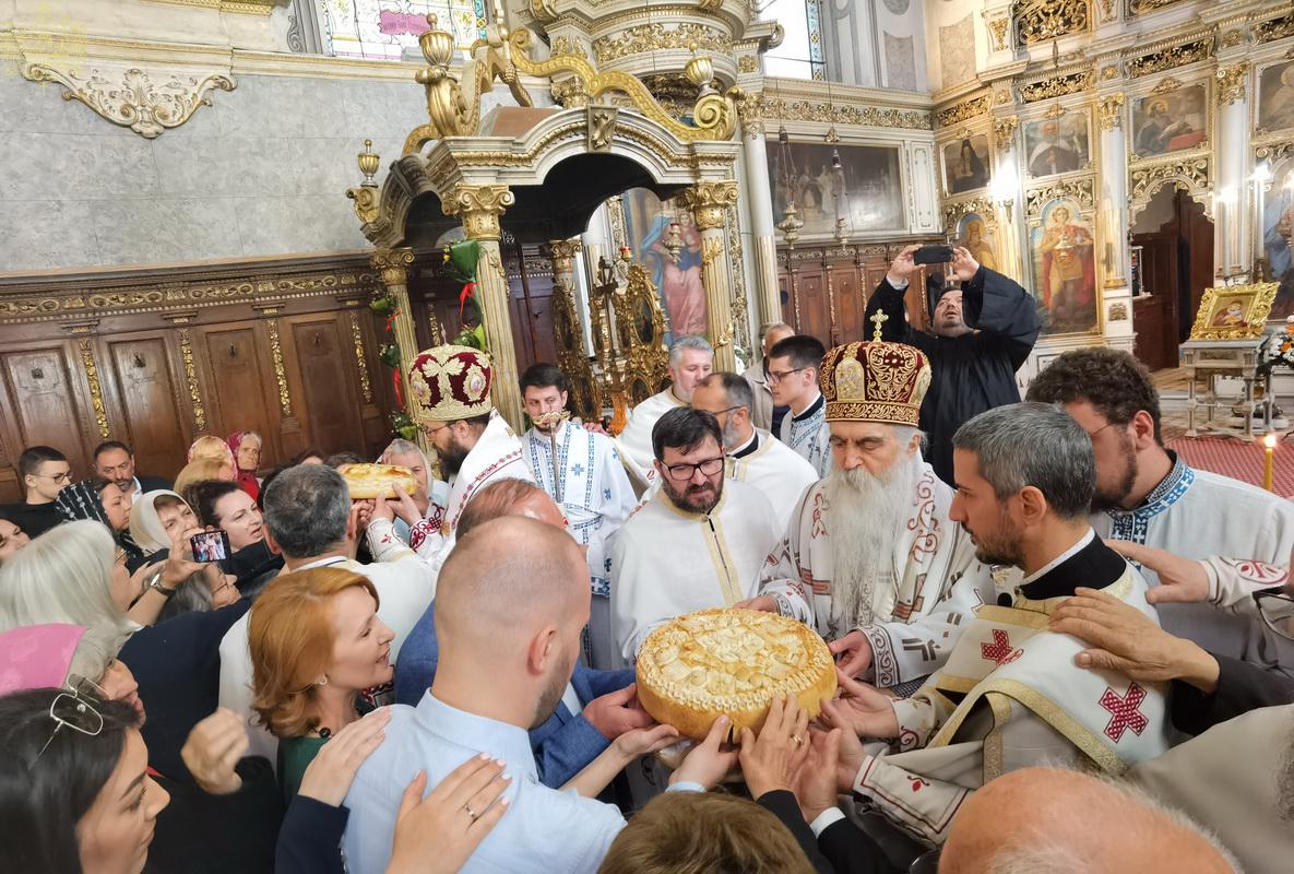 У својој архипастирској беседи после прочитаног јеванђелског зачала, Преосвећени владика Иринеј је поучио верни народ о празнику Светога великомученика Георгија. „Један од најживљих, најприснијих, најизразитијих примера мучеништва због сведочења љубави према Христу је управо личност светога Георгија. Зато се он назива великомучеником, али и победоносцем и чудотворцем, јер је Бог обдарио њега за живота да чини чудеса Именом Господњим, а и његове свете мошти по његовом упокојењу. Он није био никакав кукавица, нити слабић. Био је истакнути војник, војни заповедник у римској војсци. Није, дакле, био неко ко не зна шта значи борити се за оно што сматраш вредним борбе, а по потреби и жртве, ако буде требало. Али, када је дошло до тога да треба да бира, или да се одрекне Христа или да јавно пред гонитељима и мрзитељима исповеди своју веру у Христа, он је изабрао ово друго и зато је био мучен на најнечовечнији замисливи начин. У његовом житију се детаљно описују та страшна мучења којима је био подвргаван, али је остао доследан. Господ га је укрепљивао тако да је могао да издржи све и чак да у појединим тренуцима се показује као да није ни био мучен, јер је исцељиван благодаћу Божјом. На крају је погубљен, али то није била смрт његова него духовна смрт његових џелата, а за њега рођење за нови и вечни живот. И од тада он је велики светитељ Божји, присутан и својом молитвом заступник свих који призивају његове молитве. Зато се и ми данас радујемо овом празнику, овој слави. Ја вам свима честитам, како нашу храмовну славу овде тако и свечарима њихово крсно, породично име и нека, молитвама светог Георгија, у нашим смутним, бурним, тужним временима, када се ратује на све стране, да управо свети Георгије својим молитвама и просвећује, и надахњује и охрабрује све који су на путу Божјем. Господу нека је слава у све векове и из наших уста. Аминˮ, истакао је у беседи Преосвећени епископ Иринеј.