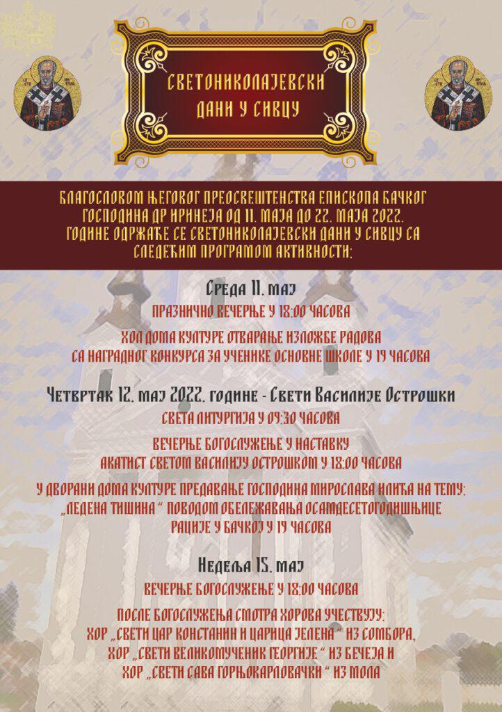 Са благословом Његовог Преосвештенства Епископа бачког господина др Иринеја, у Сивцу, од 11. до 22. маја 2022. године, биће одржана манифестација „Светониколајевски даниˮ.