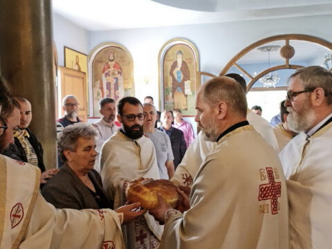 По заамвоној молитви, извршен је трократни опход око храма, а потом су освећени славски дарови, које је принела овогодишња кума госпођа Смиља Димитрић. Залог славског колача за следећу годину преузео је господин Ивица Кичић.