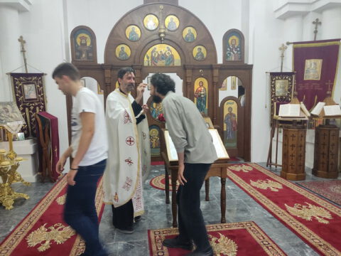 Вечерње богослужење је служио протојереј Бранислав Мркић, архијерејски намесник новосадски други, уз саслужење свештенства Епархије бачке. После чина благосиљања славских дарова, прота Бранислав је произнео надахнуту беседу. Залог кумства за наредну годину преузео је г. Дарио Анушић са породицом.