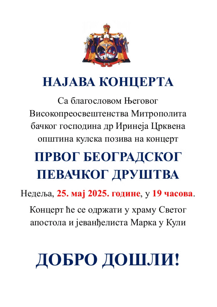 Са благословом Његовог Високопреосвештенства Митрополита бачког господина др Иринеја, у организацији Црквене општине кулске, Прво београдско певачко друштво одржаће концерт у Кули. Концерт ће бити одржан у храму Светог апостола и јеванђелиста Марка, у недељу, 25. маја 2025. године, са почетком у 19:00 часова.