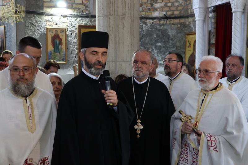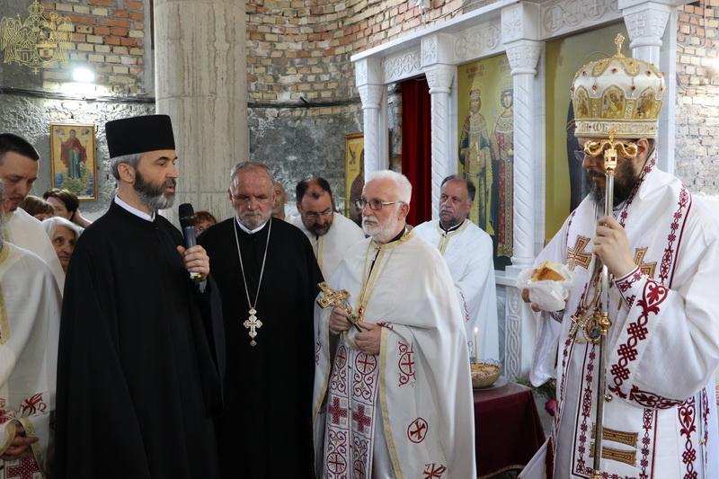 После прочитаног јеванђелског одељка, са благословом eпископа Дамаскина, беседу је произнео протојереј-ставрофор Милош Весин, који је, између осталог, рекао: „Никада немојмо заборавити да је одговорност на свакоме од нас, јер свако од нас се пројављује врло често као Савле у овоме животу, чак иако смо крштени. Јер, често у нашој свакодневици гонимо Цркву Божју. Гонимо је тако што не стајемо у њену одбрану. Гонимо је тако што ћутимо онда када би требало да говоримо као што је говорио апостол Павле. Дакле, он је био свестан своје прошлости и због тога је управо у својој прошлости пронашао извор ревности. Оно што је био Савле, то је поништио Павле, али не само да је поништио него је уздигао на један невероватан степен, поставши не тек само апостол народâ него поставши онај кога православна химнографија има на уму када данас у дивним похвалним песмама испеваним у част равноапостолних Константина и Јелене једна црквена песма каже: Имао си мудрост Соломонову, имао си кротост Давидову, али си имао и православну ревност светих апостола. Нека би Господ свима нама подарио снагу, молитвама светих апостолима равним Константина и Јелене, да постанемо, пре свега, владари својих живота, да владамо својим мислима, својим речима, својим поступцима, е да би заиста пројавили и мудрост Соломонову, кротост Давидову, али и благочешће светих апостола.ˮ