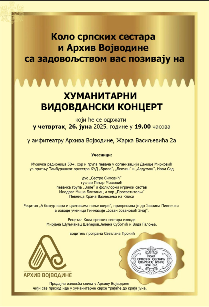 У четвртак, 26. јуна 2025. године, са почетком у 19:00 часова, у амфитеатру Архива Војводине, Улица Жарка Васиљевића 2а, одржаће се хуманитарни Видовдански концерт, у организацији Кола српских сестара Епархије бачке и Архива Војводине.