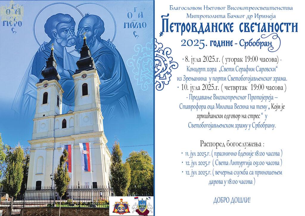 Са благословом Његовог Високопреосвештенства Митрополита бачког господина др Иринеја, Црквена општина у Србобрану, поводом празника Светих првоврховних апостола Петра и Павла – заветне славе Светобогојављенског храма, организује „Петровданске свечаностиˮ, које ће трајати од од 8. до 12. јула 2025. године, са следећим распоредом: